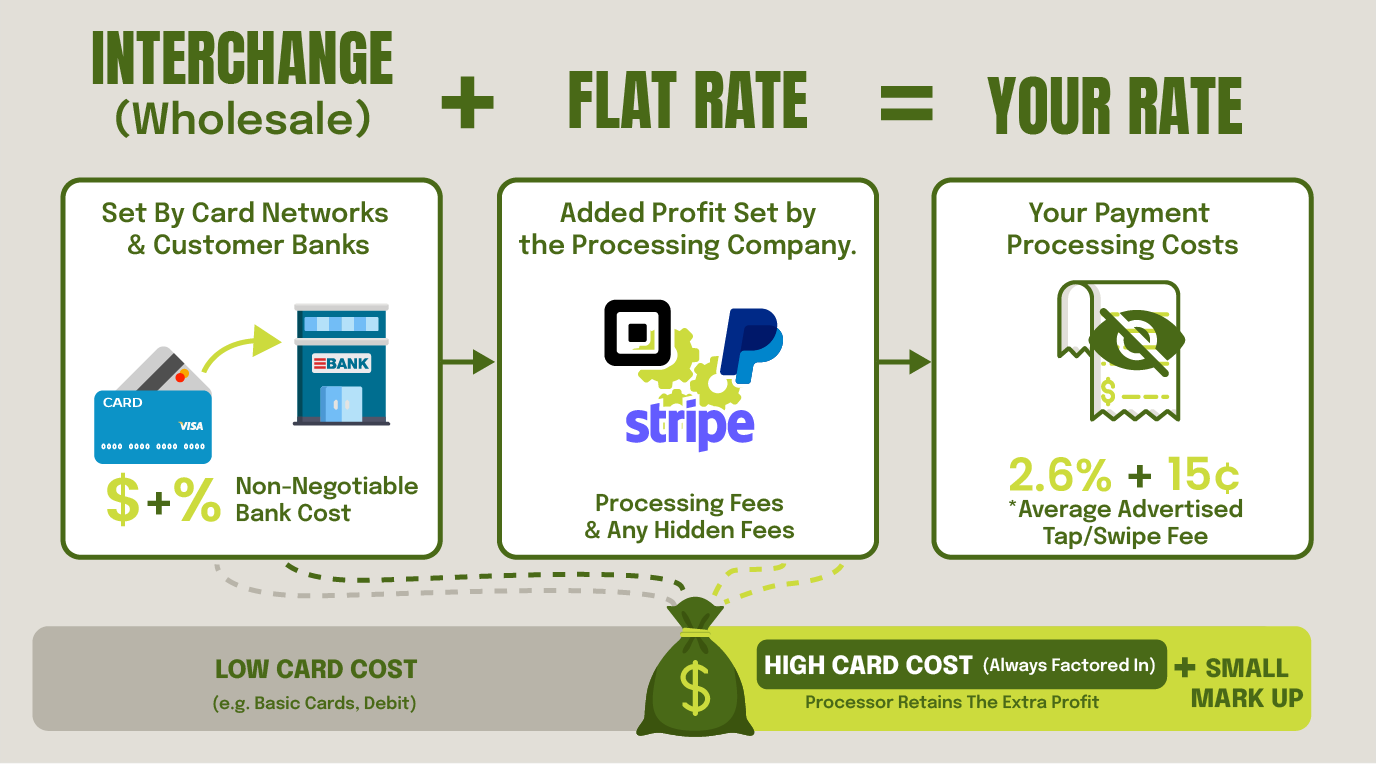 How it Works: The processor combines the wholesale rate (interchange) and their processor markup into a single fee. Common examples include Square or Swipe, often charging around 2.6% + 15¢ for in-person "card-present" transactions. Those are the transactions taken in the store.