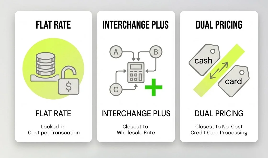 | Feature | Flat Rate | Interchange Plus | Dual Pricing |