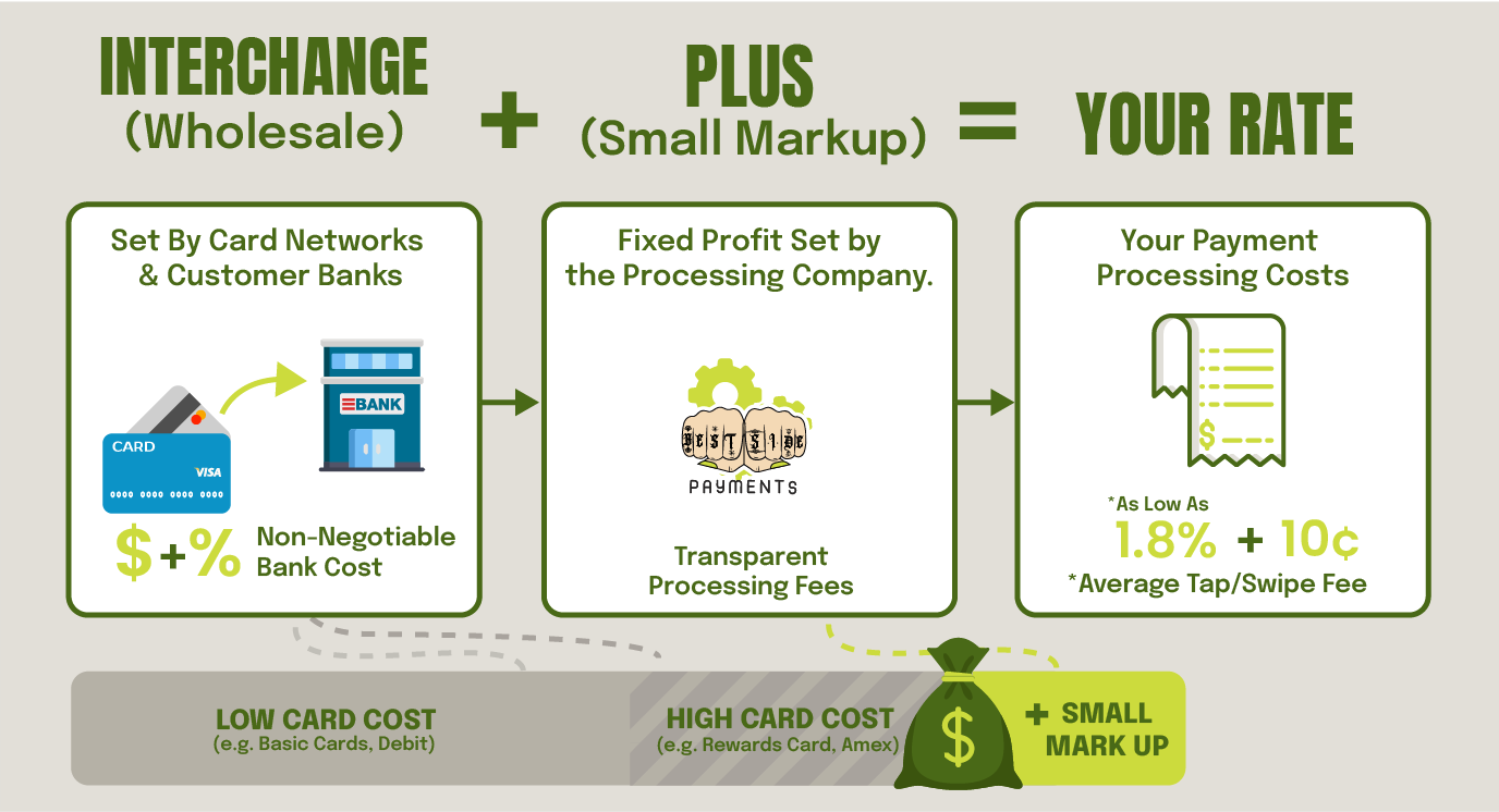 How it Works: You pay the interchange ("at-cost" price) from the card network plus a small, fixed markup fee to your processor. For simplicity, lets say your mark up was 1% with your business for in-person "card-present" transactions (the ones taken in the store). That’s the “Plus”.